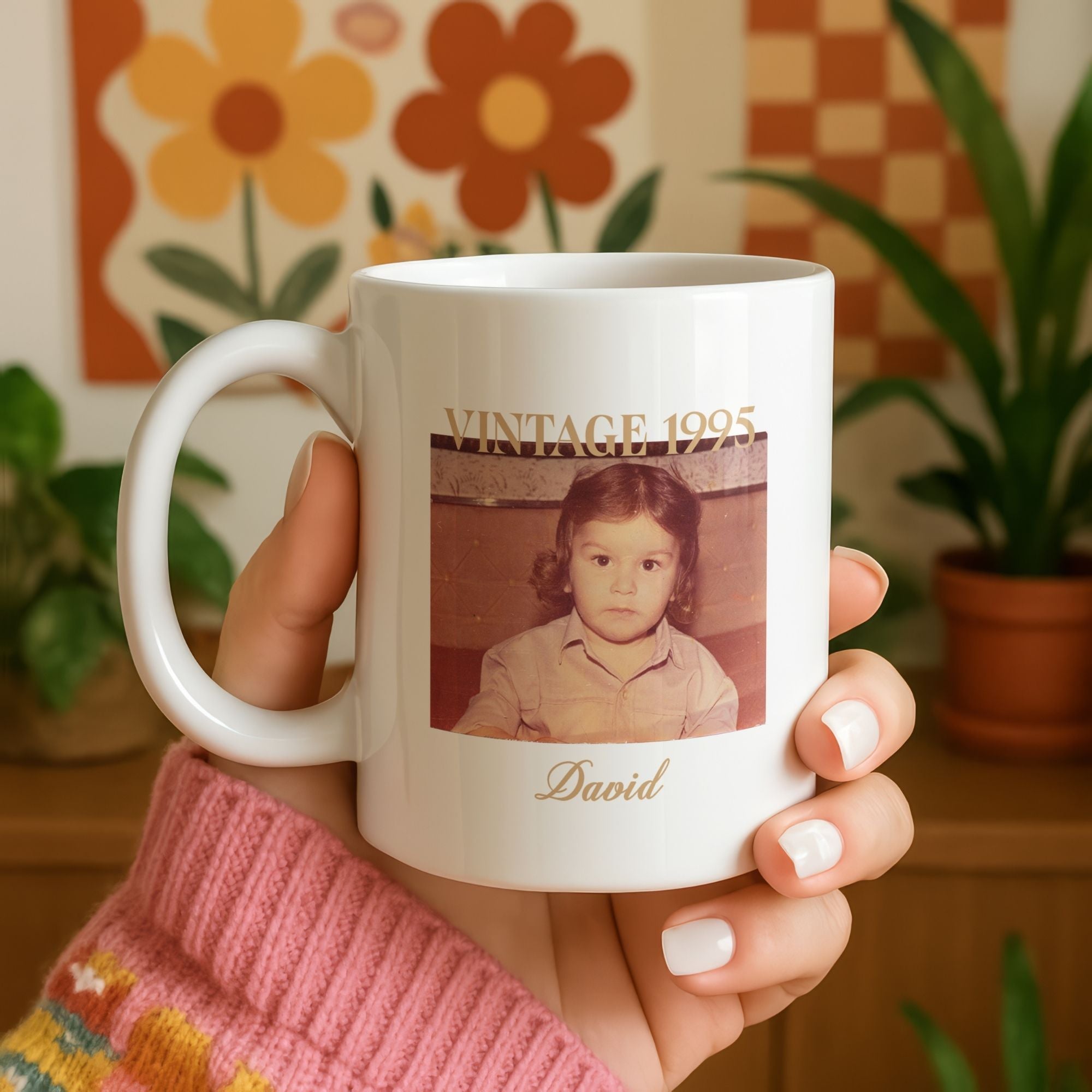 Looking for the most sentimental Birthday Gift? Our Personalized Vintage Birth Year Photo Mug turns a cherished memory into a daily treasure. Featuring a classic film-inspired layout with "VINTAGE" and their specific birth year, this mug captures the essence of the good old days with a modern, high-quality finish.