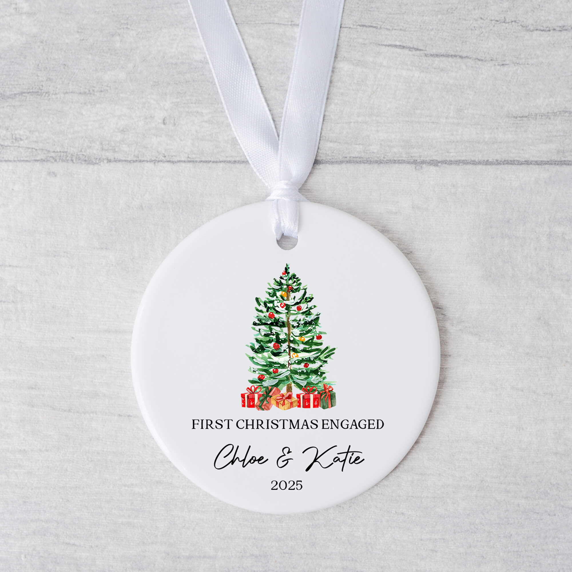 Mark one of life’s most beautiful milestones with this elegant personalised ceramic ornament — whether it’s your first Christmas engaged or your first Christmas married. Featuring a festive Christmas tree design and your custom names and year, it’s the perfect keepsake to commemorate your special moment.