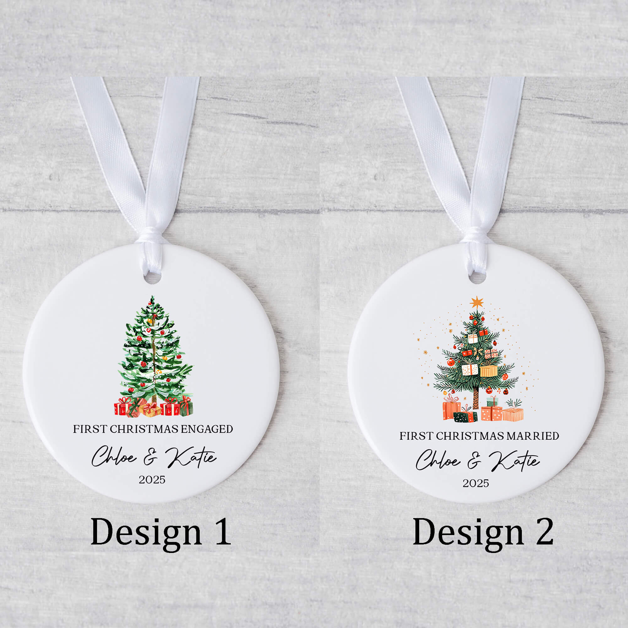 Choose between “First Christmas Engaged” or “First Christmas Married” and personalise with your names and year. Each ornament is made with care and designed to capture your love story in a timeless way that will bring warmth to your holiday décor for years to come.
