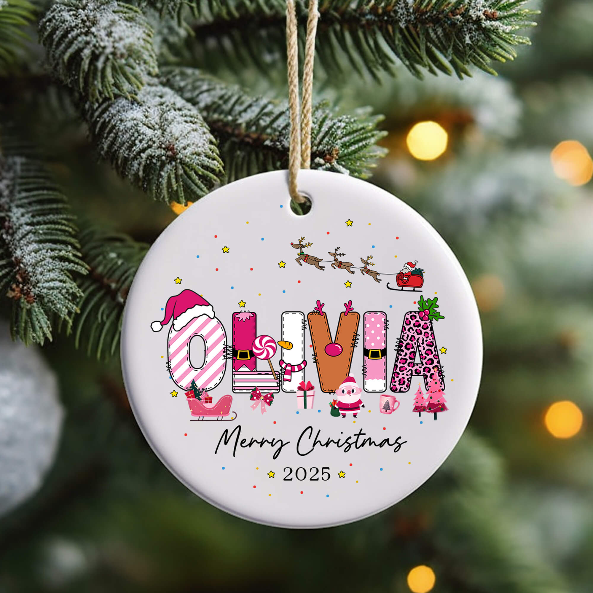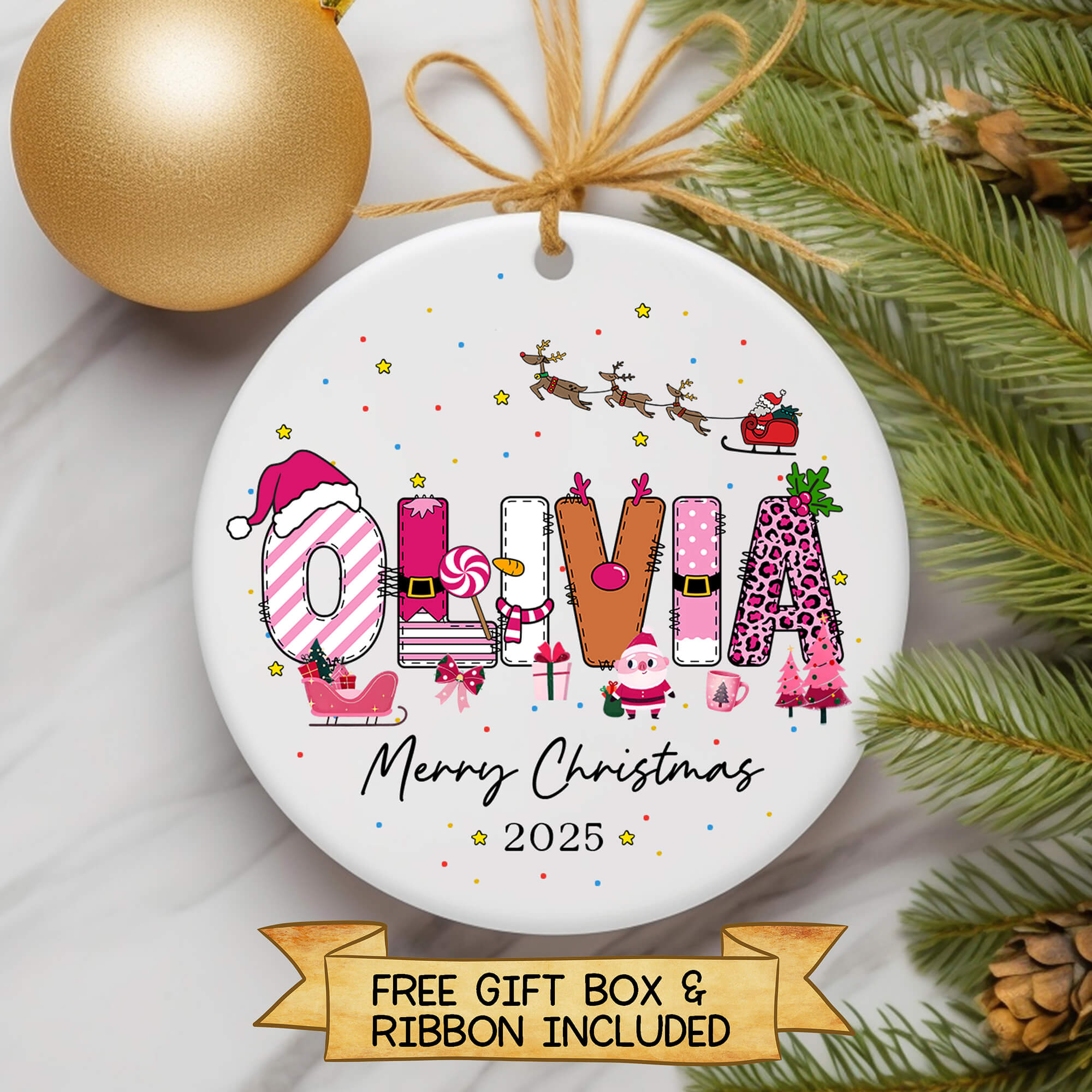 Personalised Christmas Name Ornament – Cute Pink Festive Kids Bauble