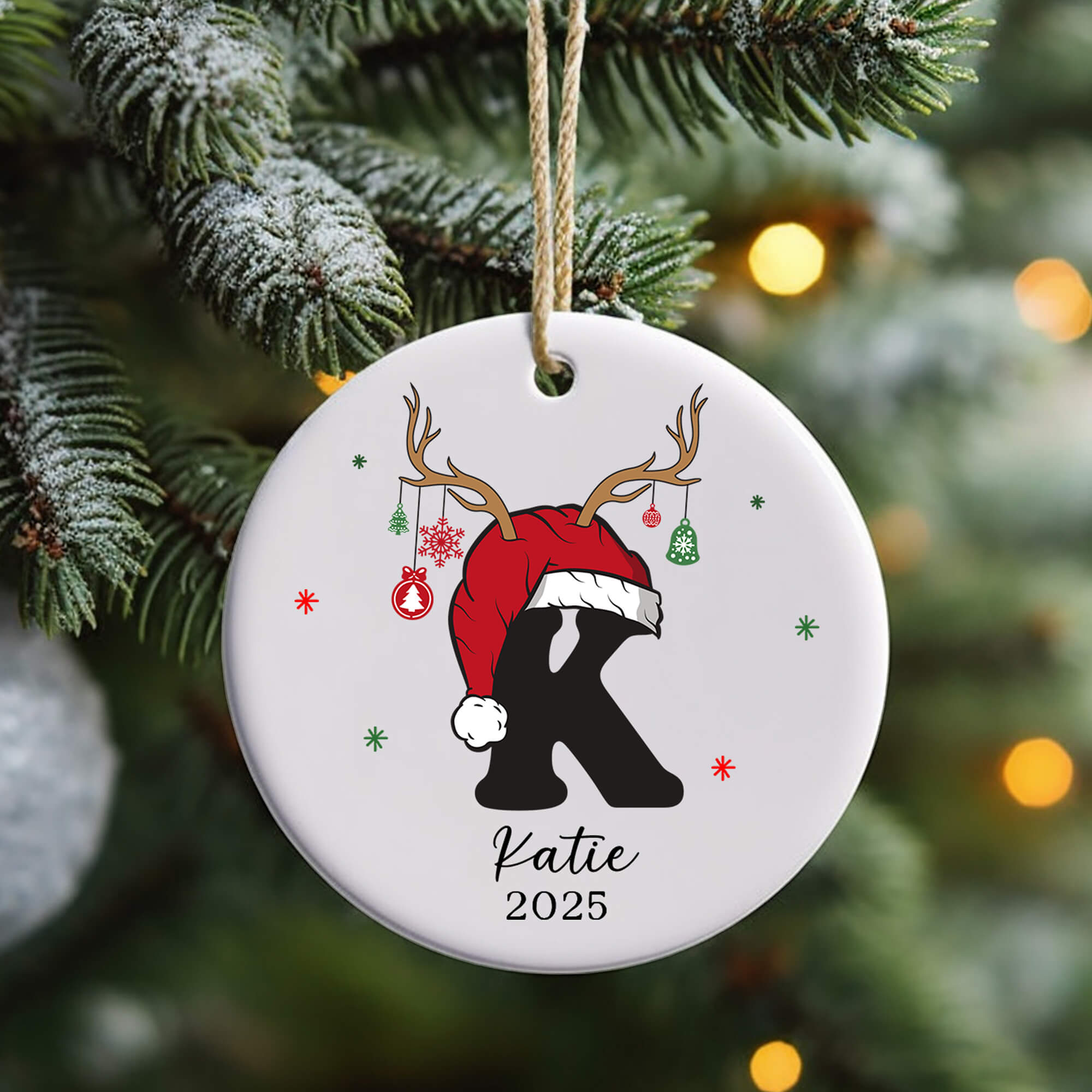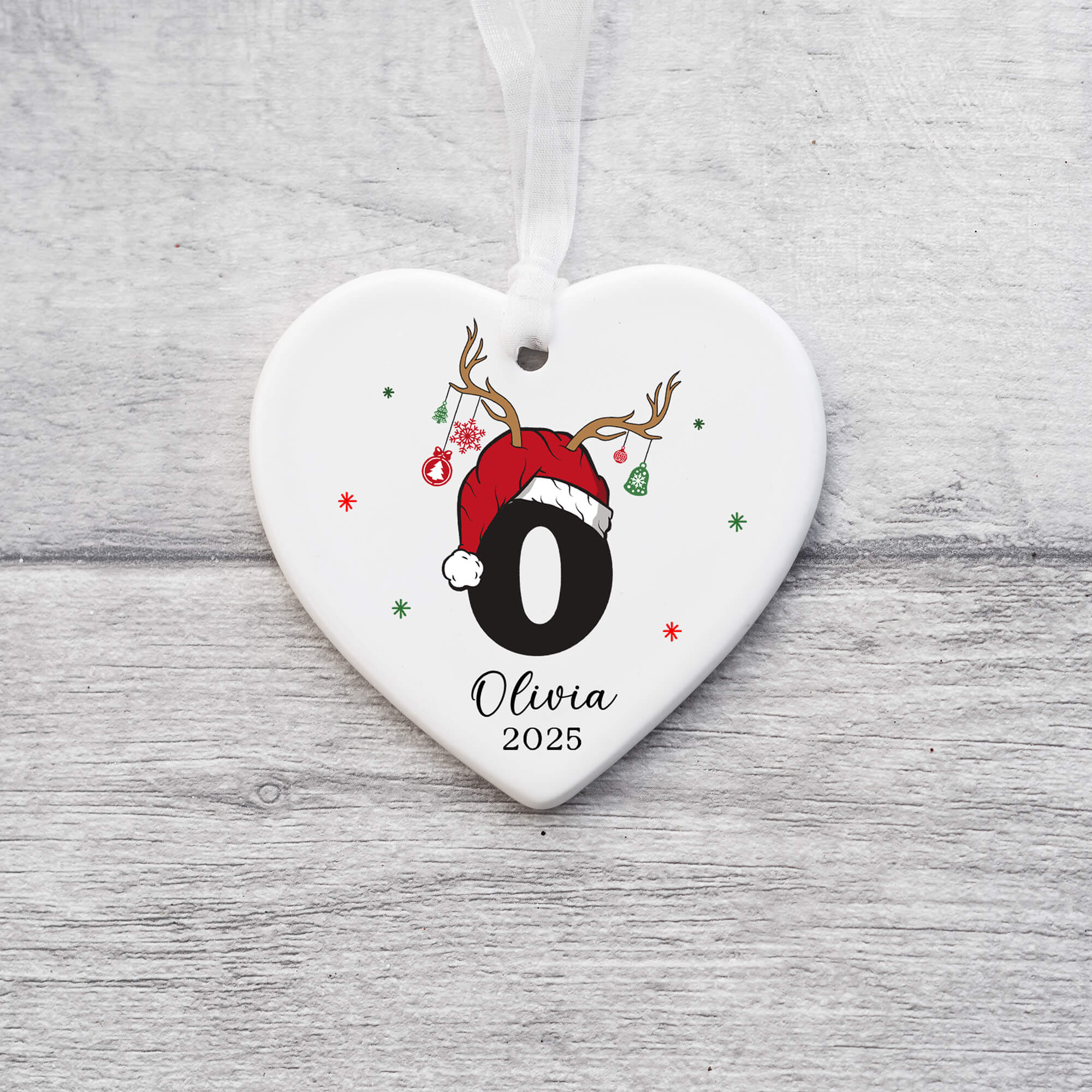 Personalised Christmas Initial Ornament – Reindeer Antlers & Santa Hat Design